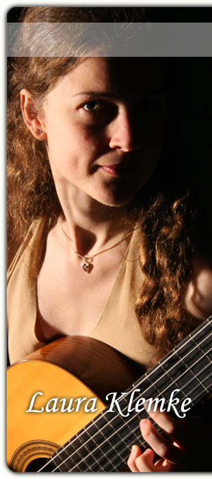 Herzlich Willkommen auf der Website der Gitarristin Laura Klemke. Neben Infor­mationen zu z.B. Biographie, Repertoire und Ensembles freuen wir uns insbesondere, Ihnen unter "Medien" direkt einen Eindruck von den wundervollen Gitarrenklängen als Audio und Video geben zu können. Vielleicht möchten Sie auch eines der nächsten Konzerte besuchen oder eine CD erwerben, um die wunderschönen Klänge auch in Ihrem Wohnzimmer erleben zu können. Wir wünschen viel Spaß beim Stöbern.